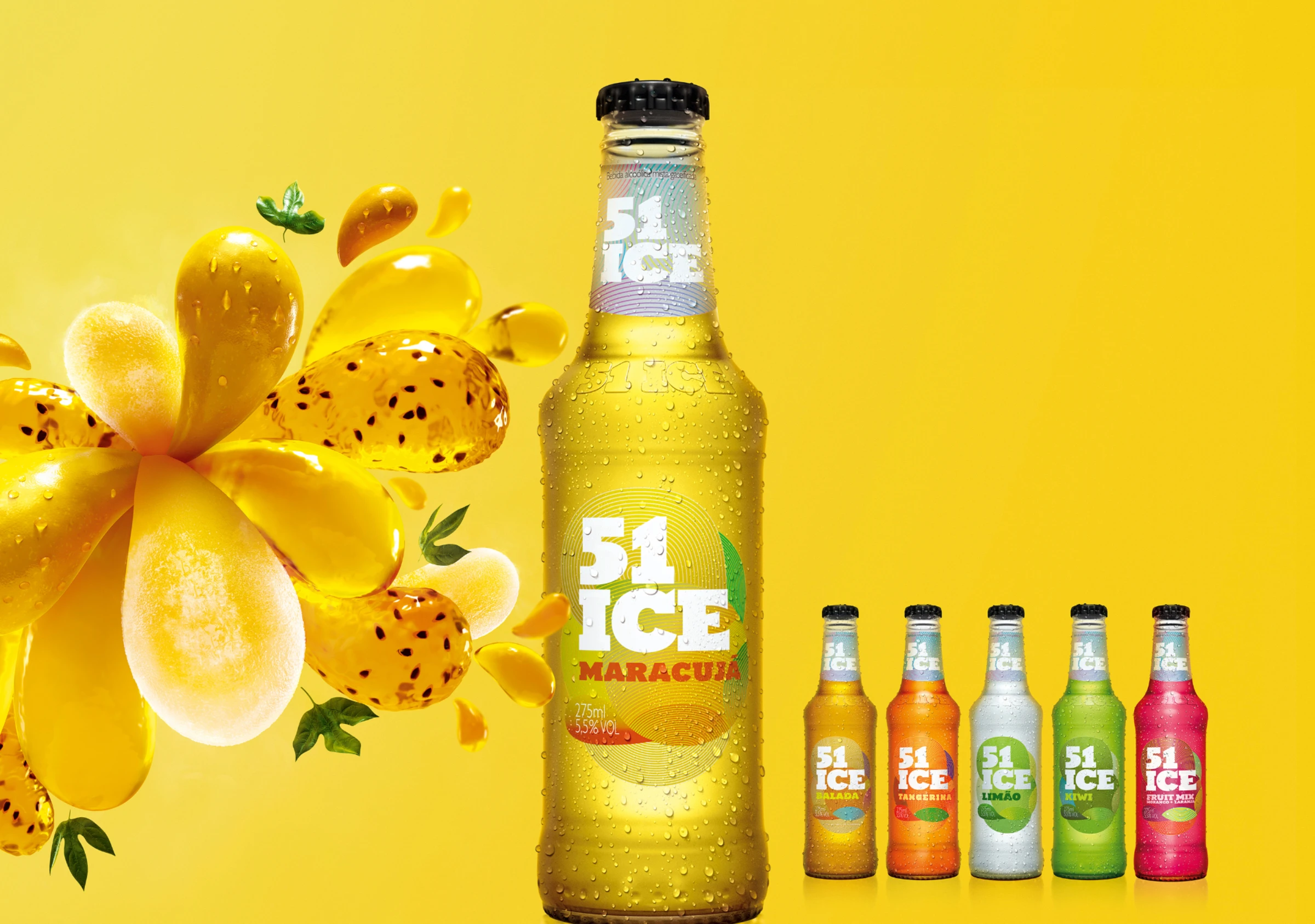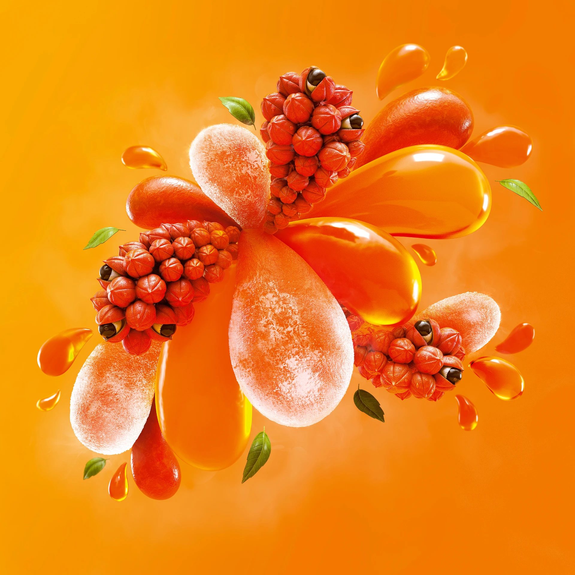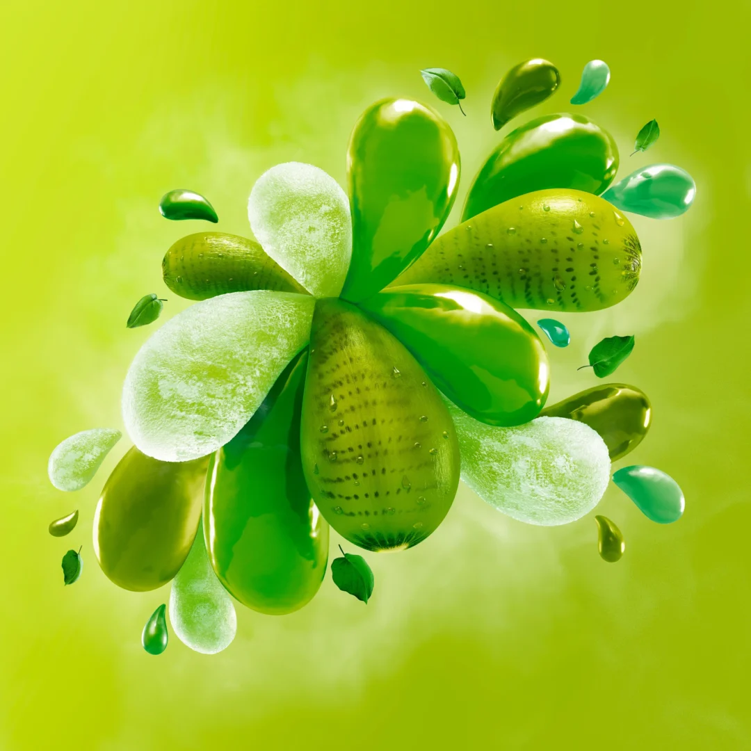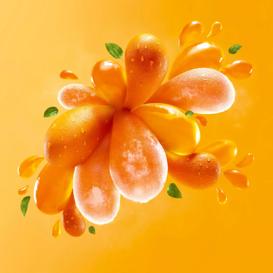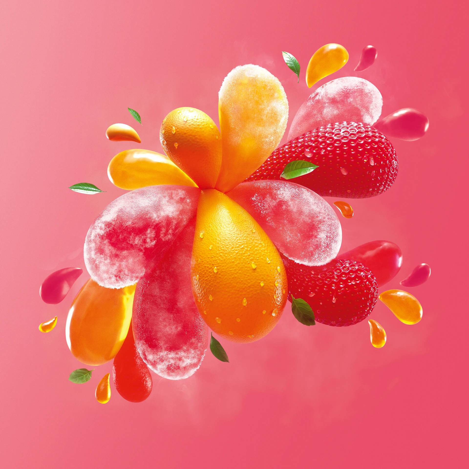 Ilustramos as gotas em 3D com a textura da casca e do interior da fruta, algumas gotinhas de líquido e outras com o aspecto gelado de frozen. Fizemos também a ilustração 3D da garrafa, gotinhas de suor e a troca de rótulo e cor do líquido em pós para variação dos sabores.