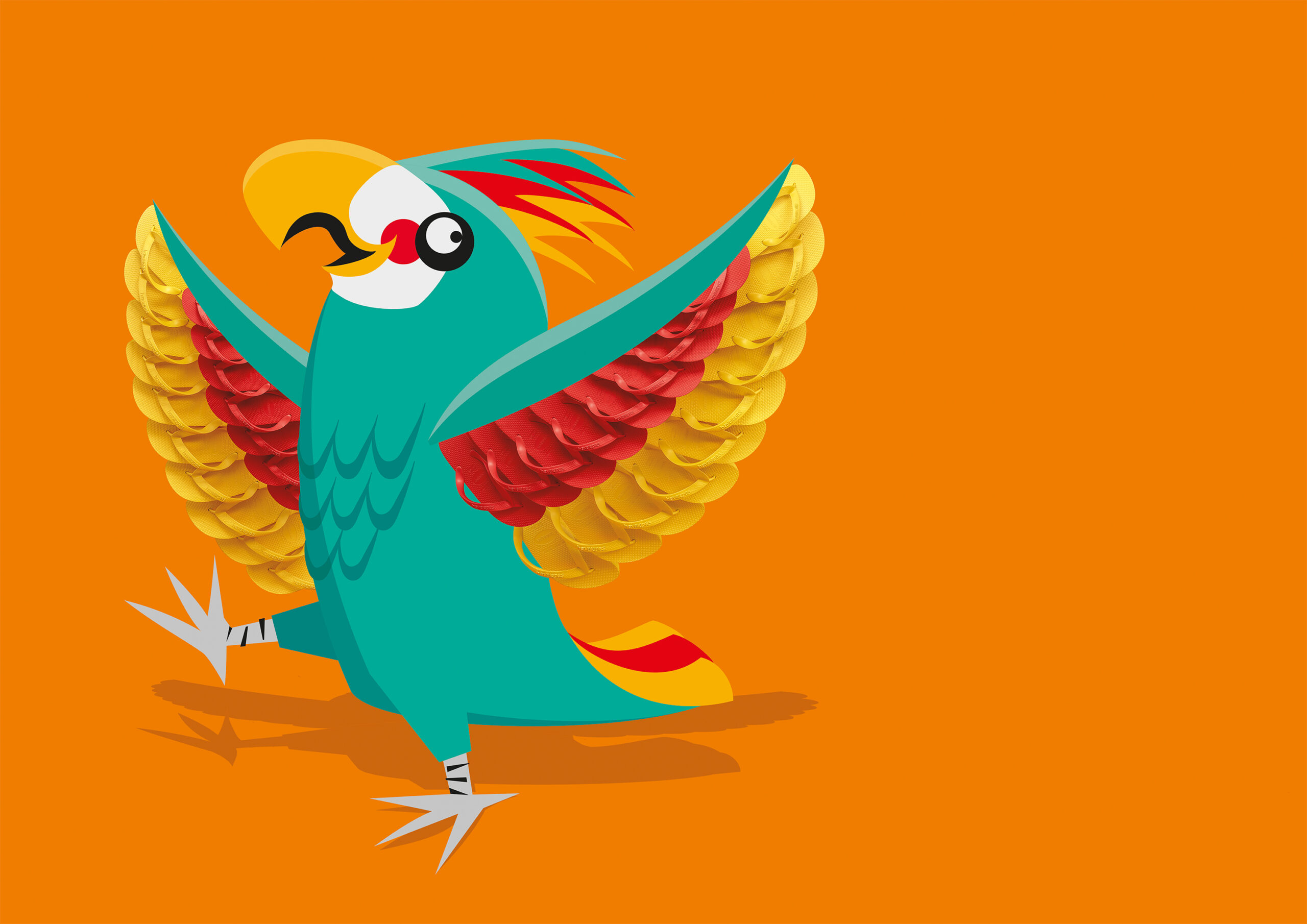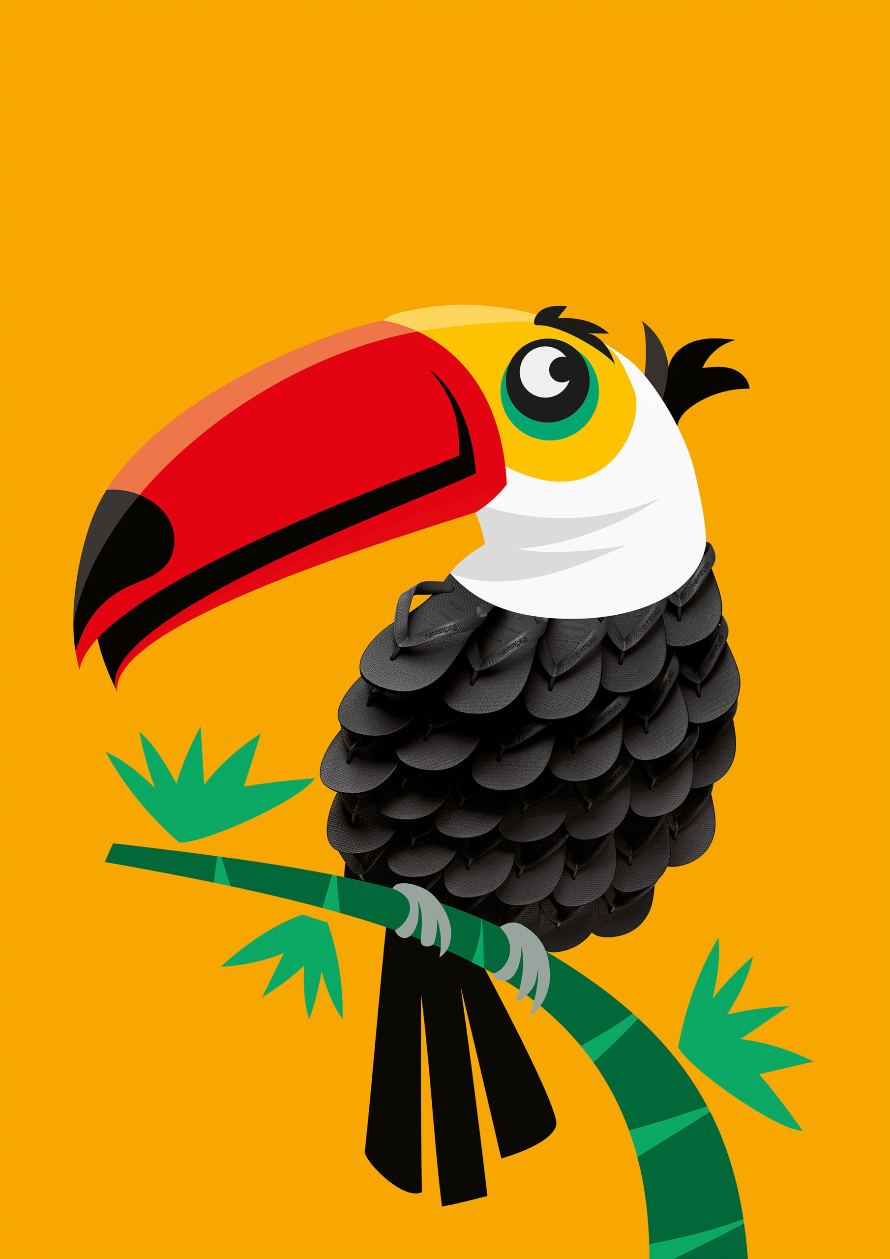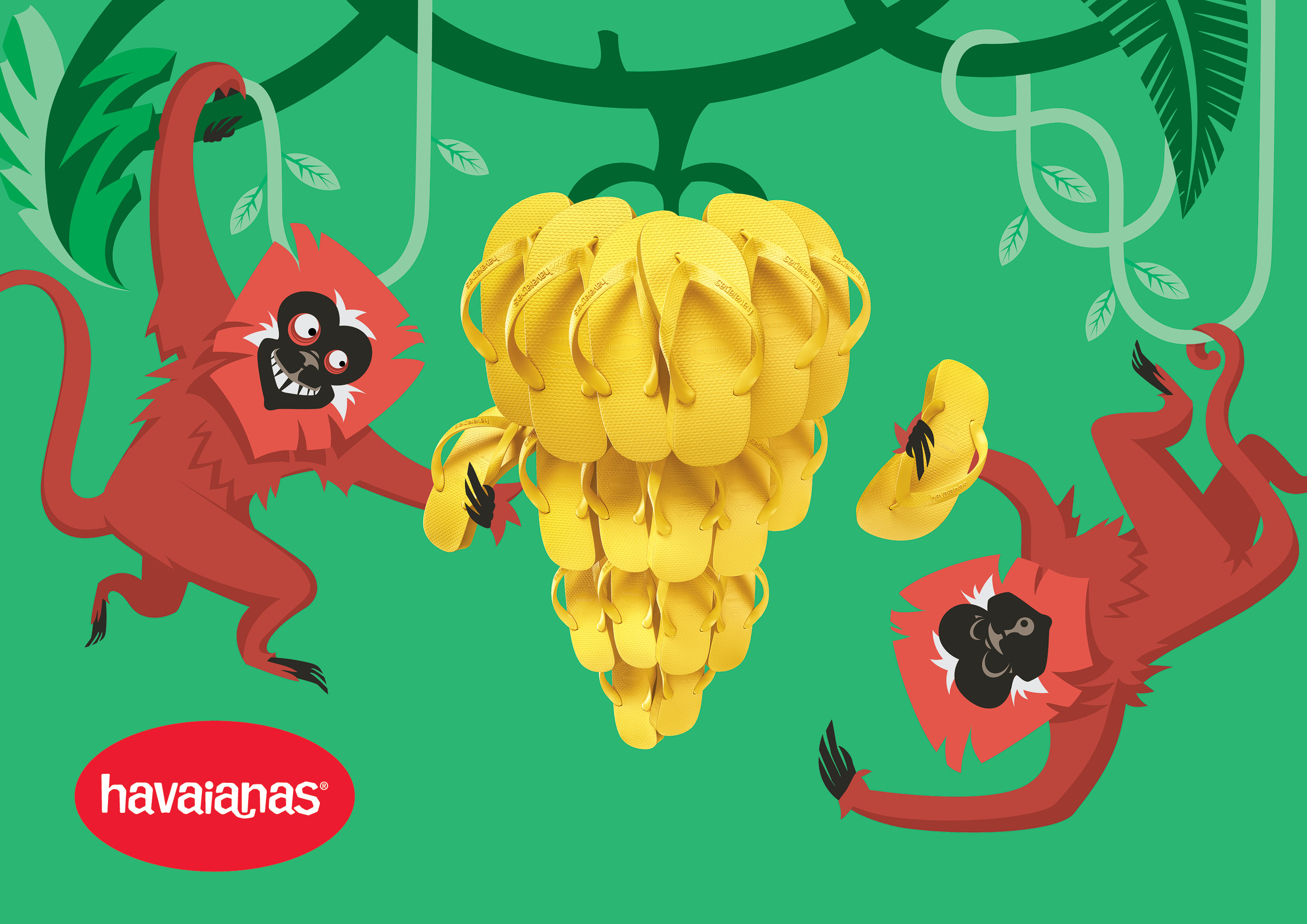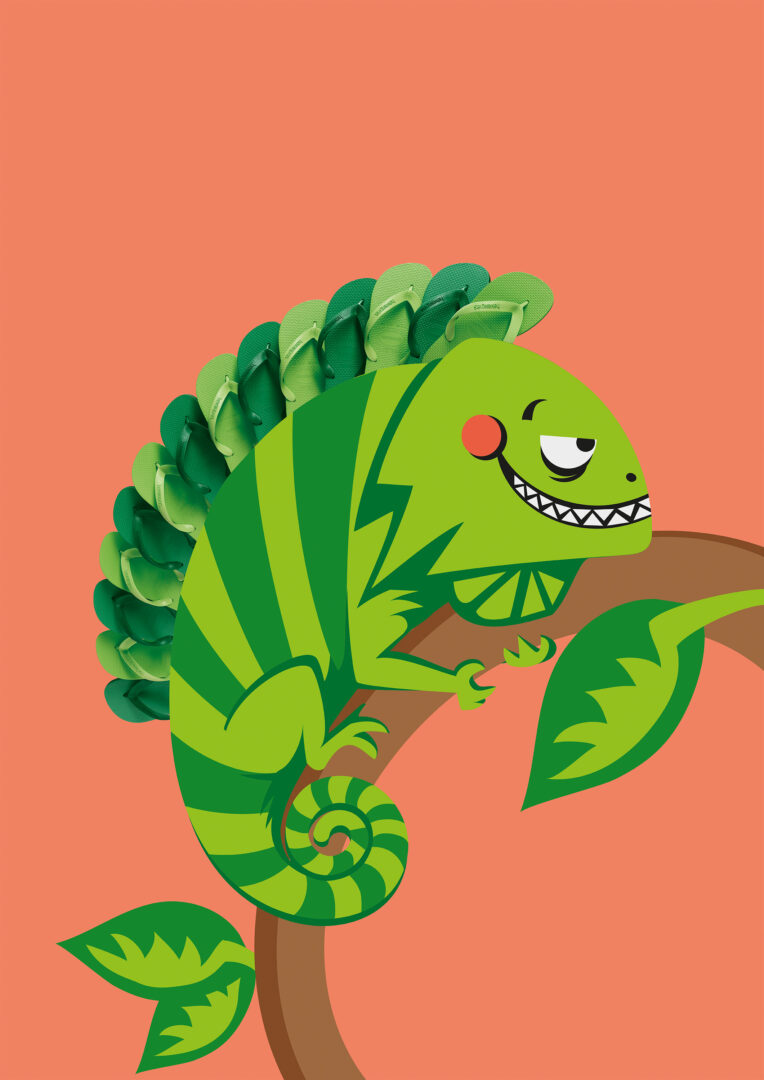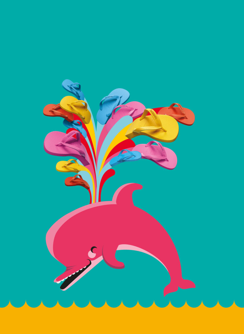 Nós fizemos este trabalho em parceria com a Jú Pontual, diretora de arte e ilustradora de todos os bichinhos desta campanha. Ilustramos as sandálias em 3D seguindo as marcações feitas por ela e o resultado são essas montagens divertidas e coloridas.