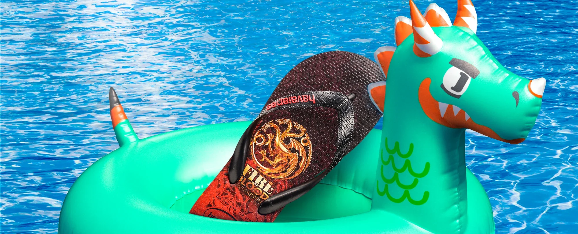 Para a campanha de divulgação das sandálias Game of Thrones, desenvolvemos todas as boias em 3D, trazendo riqueza de detalhes e